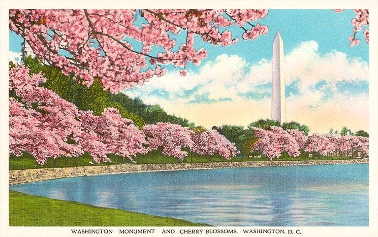 Elevate your inventory with this classic 3.5" x 5.5" postcard featuring an image from our Washington D. C. collection titled Washington Monument, Cherry Blossoms.